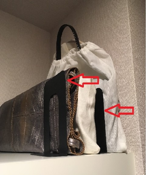 左端のトートバッグを取ると他のバッグが倒れてしまいます。